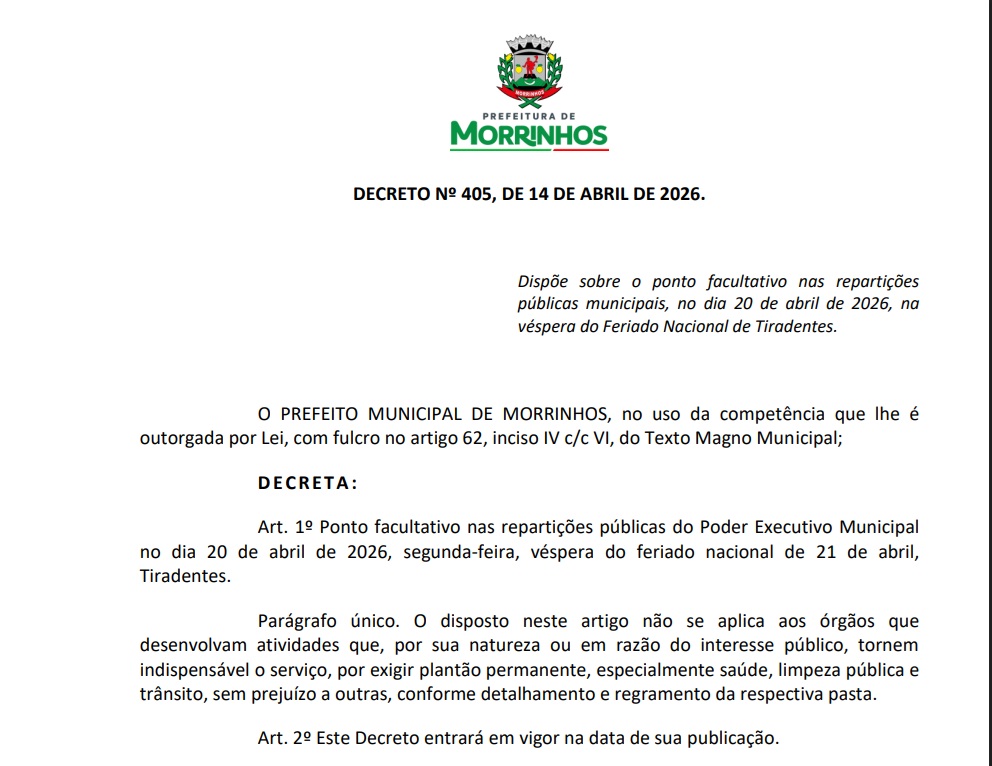 A Prefeitura de Morrinhos publicou, nesta segunda-feira (13), o Decreto nº 403/2026, após a identificação de indícios de um esquema de…
