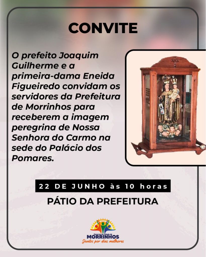 Neste dia 22 de junho, a Assessoria de Comunicação da Prefeitura reforça o convite para a programação de recebimento da imagem da padroeira de Morrinhos – Nossa Senhora do Carmo. Será às