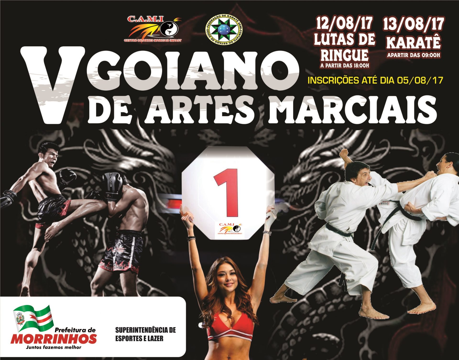 Morrinhos se prepara para receber o V Goiano de Artes Marciais, no Ginásio Nego Romano, nos dias 12 e 13 de agosto. O evento tem o apoio da Prefeitura de Morrinhos, através da Superintendência de Esportes, e conta com a organização do Centro de Artes Marciais Impact (CAMI). O torneio é dividido em lutas de ringue e karatê.