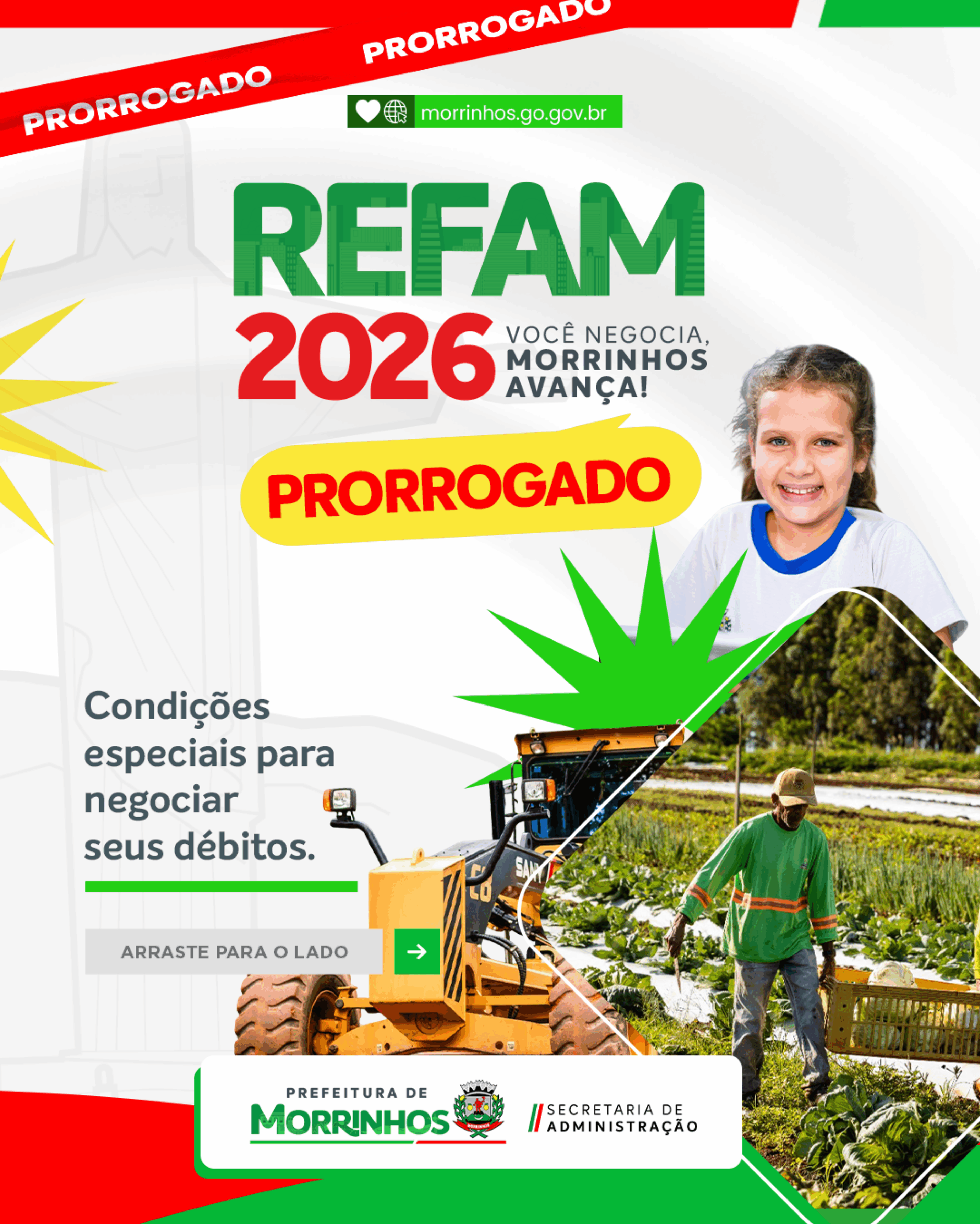 A Prefeitura de Morrinhos informa que o prazo para aderir ao Negocie Já – REFAM 2026 foi prorrogado até o dia 30 de abril, ampliando a…