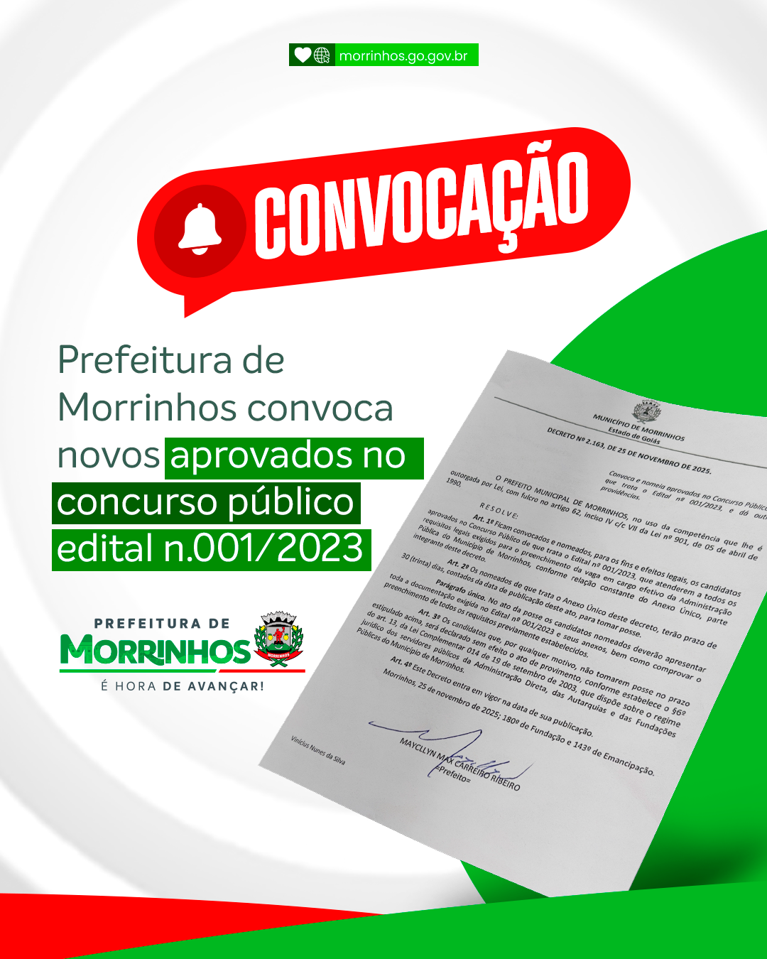 A Prefeitura de Morrinhos publicou o Decreto nº 2.163, de 25 de novembro de 2025, convocando novos candidatos aprovados no Concurso Público do Edital nº 001/2023. A convocação contempla cargos essenciais e reforça o compromisso da administração municipal com o fortalecimento dos serviços públicos.