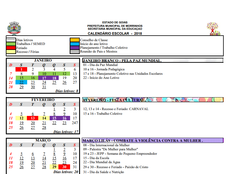 A prefeitura de Morrinhos, por meio da Secretaria Municipal de Educação – SEMED, considerando a Resolução CEE-CP nº 07 / 2017, que estabelece diretrizes para elaboração do calendário escolar, divulgou o calendário do ano de 2018 com as datas do início do ano escolar e letivo.
