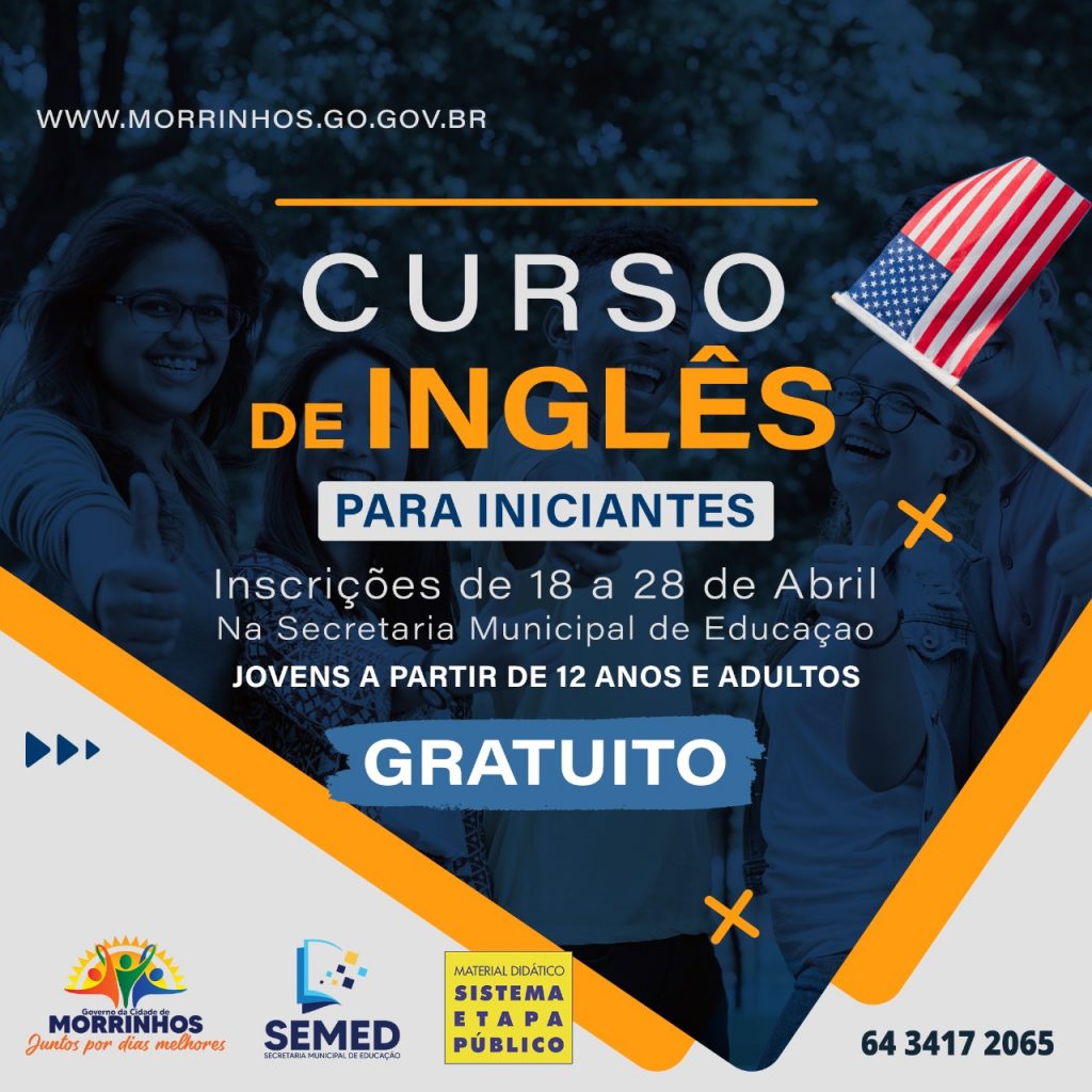 A Prefeitura de Morrinhos, por meio da Secretaria de Educação, disponibiliza, em parceria com o Sistema Etapa Público, 50 vagas para o Curso de Inglês. As inscrições são gratuitas e seguem de 18 a 28 de abril na sede da Semed. No edital contém informações sobre o público-alvo, documentação necessária e outros detalhes. Os interessados devem procurar a coordenação pedagógica pelo contato (64)3417.2065.