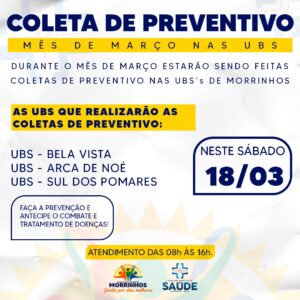 A Secretaria Municipal de Saúde, por meio da Gerência de Ações Básicas e Prevenção da Saúde, informam que continuam, durante todo o mês de março, as coletas, aos sábados, para o exame preventivo papanicolau, nas Unidades Básicas de Saúde – UBS’s.